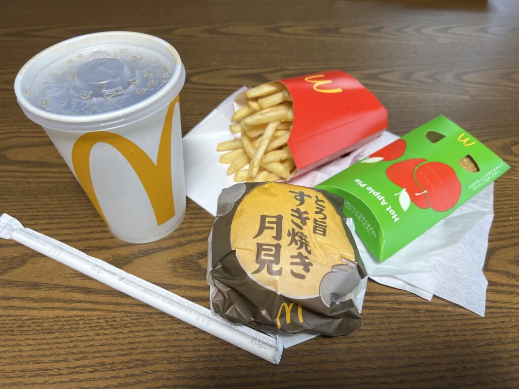 マクドナルドで購入したのは「とろ旨すき焼き月見バーガーセット(内税790円)」のポテトM、コカ・コーラMセット。それに「ホットアップルパイ(内税140円)」を追加。