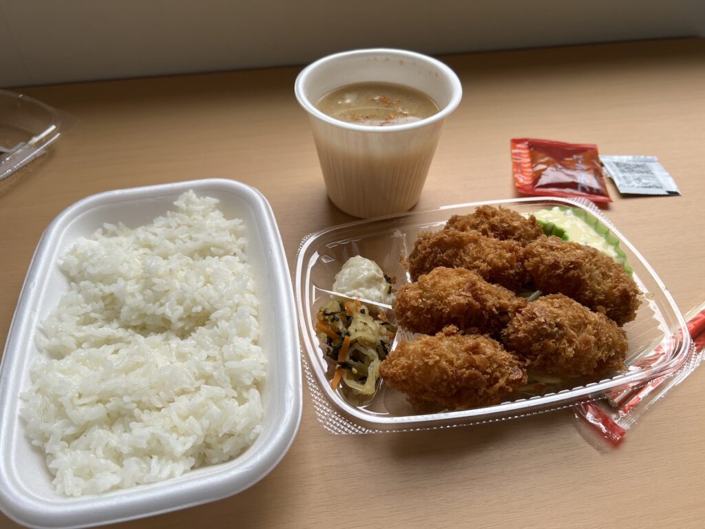 事前に「10分から15分」って言われたけど、結局20分近く待つ羽目に。お腹が空いたと思いつつ会社に戻ったらおえらいさんが来客していた。挨拶だけして買ってきた「6個入りカキフライ弁当(内税970円)」と「特製豚汁(内税160円)」を広げる。ほっともっとで1,000円超えちゃうとか贅沢ではある。