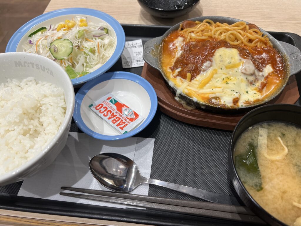 食べてみるとなるほど…これは見た目通りの「やんちゃな味」だ。鉄板ナポリタンなので下に卵が敷いてある、思ったよりもナポリタンの量が多い。美味しいけど、やっぱり高いよなあ。素材の一個一個はいつもの松屋クオリティだし。