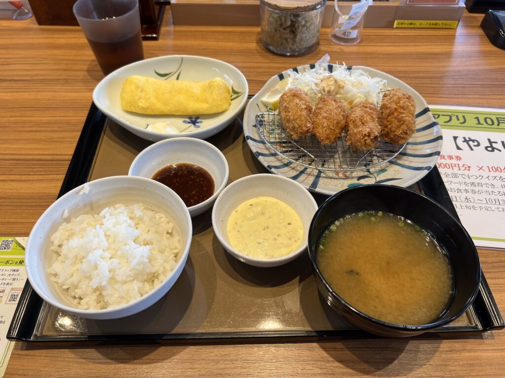 昼前にクルマでごはんを食べに行く、外がめっちゃ寒い。「やよい軒 二十四軒店」に来たら駐車場は思ったよりは混んでない模様、店の外も行列とかは無いので一安心。券売機で「カキフライ定食(4個)(クーポンで内税1,060円)」と「玉子焼き(内税290円)」を注文して待つ、結構待たされてから到着。