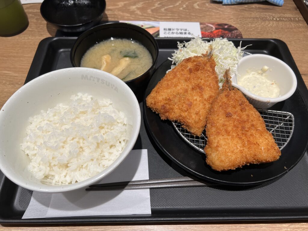 帰りに自宅最寄りの「松屋・松のや併設店」に来た。クーポンを使って注文しようとするも三台ある注文端末のレスポンスが非常に悪い、なんだコレ? クーポンのQRコードもなかなか読み取れずイライラする。なんとか「アジフライ定食(クーポンで内税780円)」を注文、なんか発券もレスポンスが悪い。支払いは別端末なのでちょっとマシ。しばし待って番号呼び出されるので受け取り。