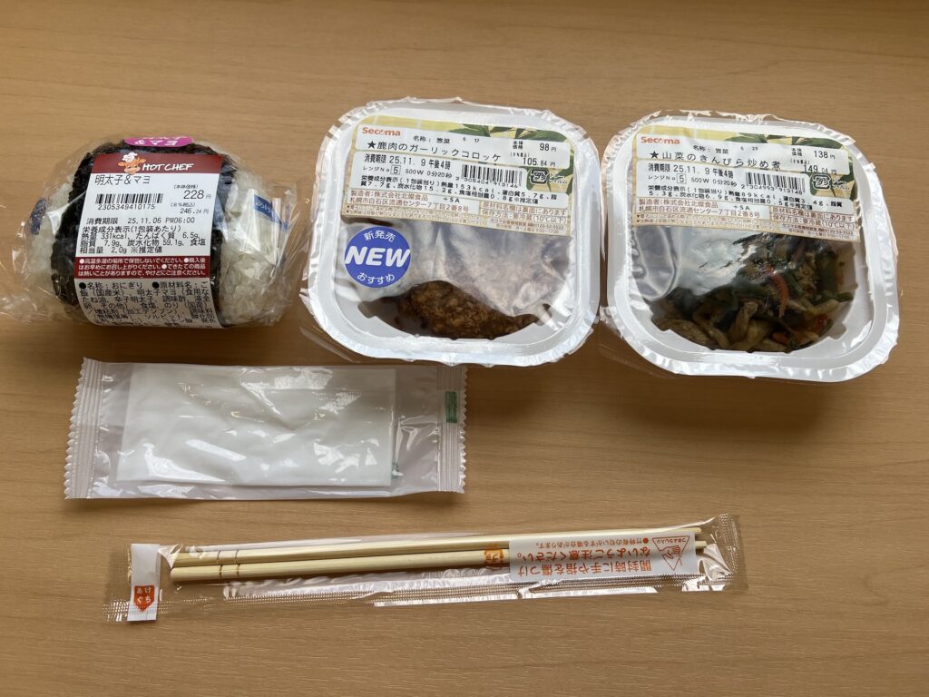 昼ちょっと前に会社に鍵をかけて外出、最寄りセコマに「ホットシェフ タレカツ丼」を買いに来たが売ってない、自宅近くのセコマには昨日あったのに。気になってた「鹿肉のガーリックコロッケ(外税98円)」があったので、これに「山菜のきんぴら炒め煮(外税138円)」「ホットシェフおにぎり 明太&マヨ(外税228円)」を合わせて購入。会社に戻ったらちょうど昼休みに突入したので昼食。