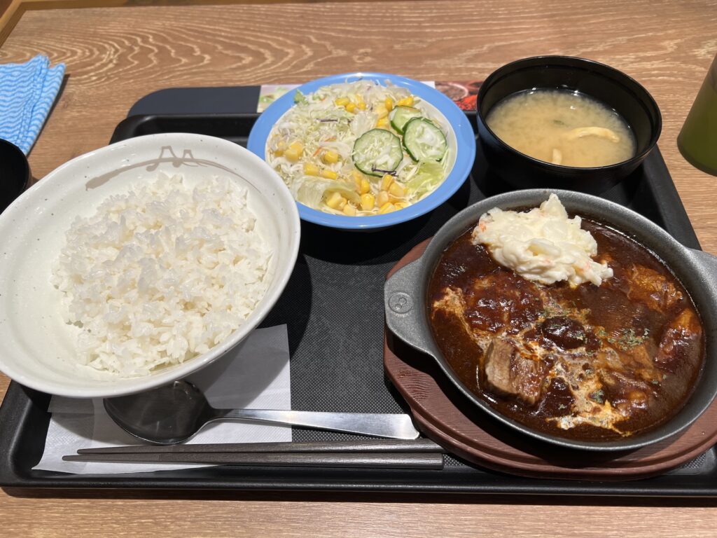 昨日から始まった期間限定「煮込みビーフシチューハンバーグ定食(クーポンで100円引の内税1,180円)」をごはん大盛りで注文。しばし待った後に受け取り、これ大盛りなんか? 特盛に見えるんだけども。
