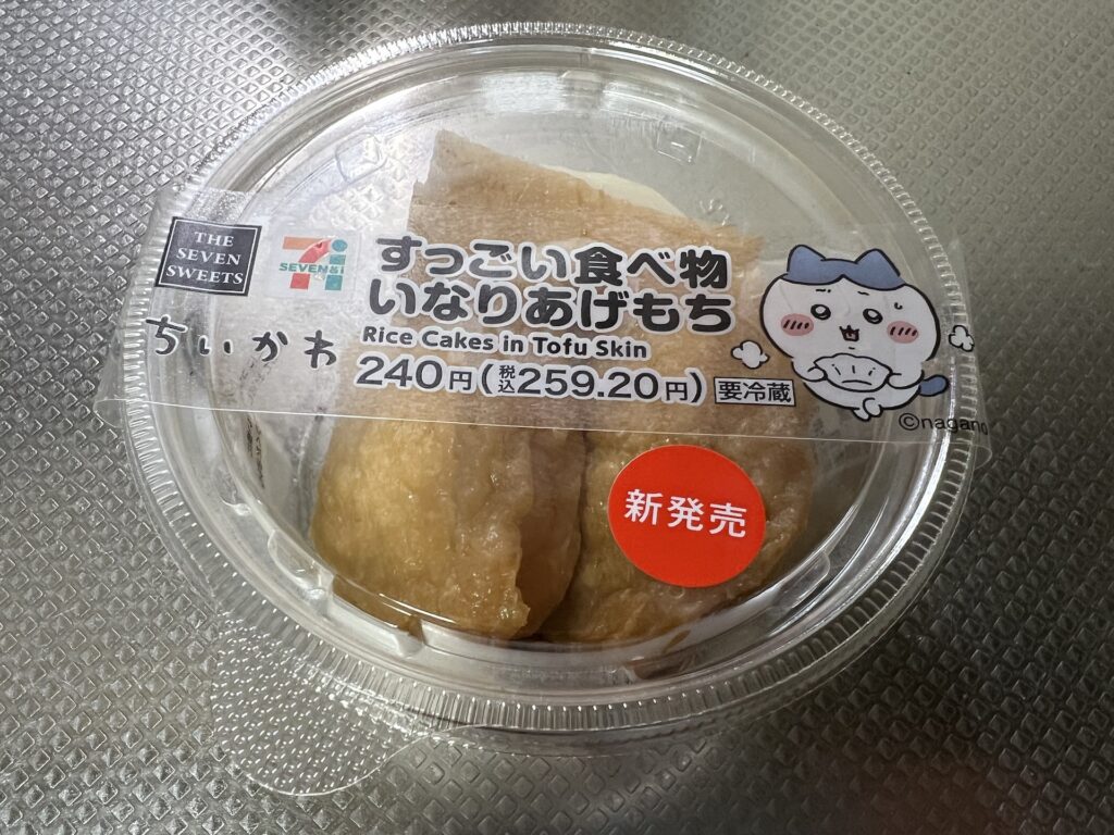 晩ごはんの後に、昼にセブンイレブンで買ってきた「すっごい食べ物 いなりあげもち(外税240円)」を食べてみる。美味しい、しょっぱいと甘いが同時に来る。