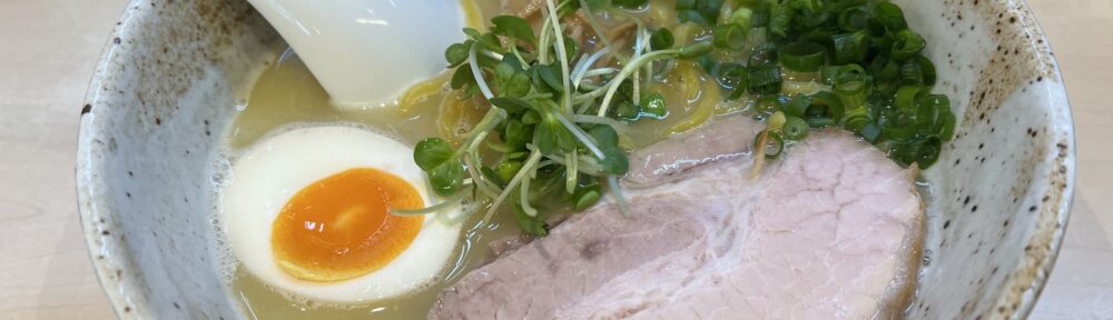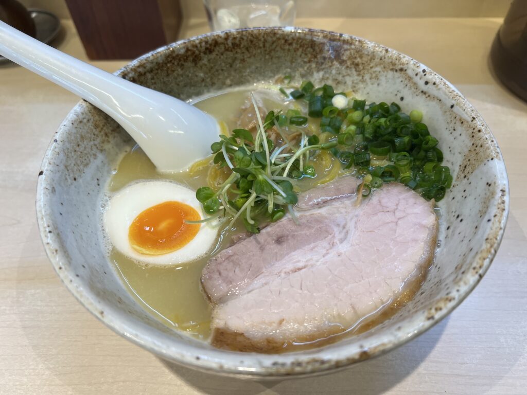 券売機で食券を購入、「塩ラーメン(内税950円)」に「玉子半玉(内税50円)」、そこに「みにらいす(内税80円)」を追加しようと思ったらボタンが押せない、せっかくだから「チャーシューめし(ワサビ醤油)(小)(内税300円)」にするか。店員さんに渡してしばらく待ってたらカウンターに案内されて着丼。ちょっと遅れてチャーシューめしも来た。