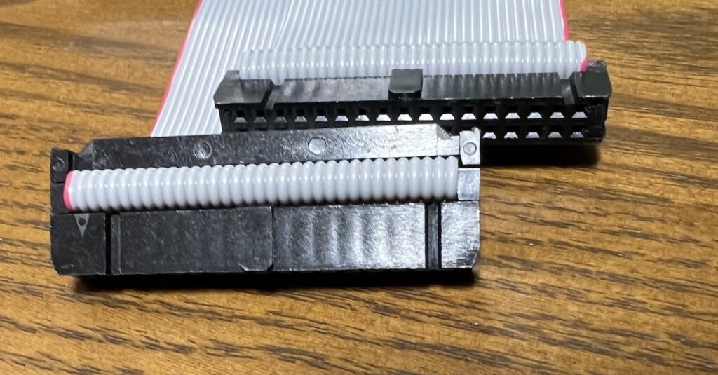 改めて「内蔵FDD ID切り替え機構基板」付属のフラットケーブルを見る。2本あるのだが、1本は…これ片方のコネクタが逆についてるっぽい。ダメじゃん。コネクタの左側に三角マークが付いててここが一番ピンなのだが、写真の右奥側コネクタが逆なんですな。