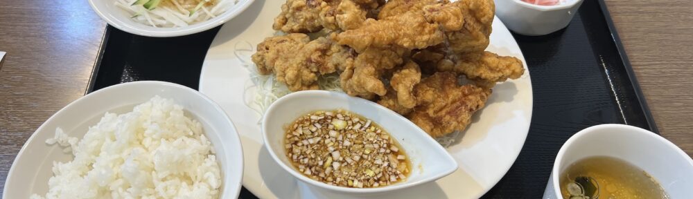 注文は期間限定らしい「鶏から揚げ定食 ライス中(内税1,230円)」、出てきたらすげえ量で出てきて目を疑った。食べ切れるか心配になるのも久しぶり。周りの座席の人がこっちをチラチラ見てきて恥ずかしい。