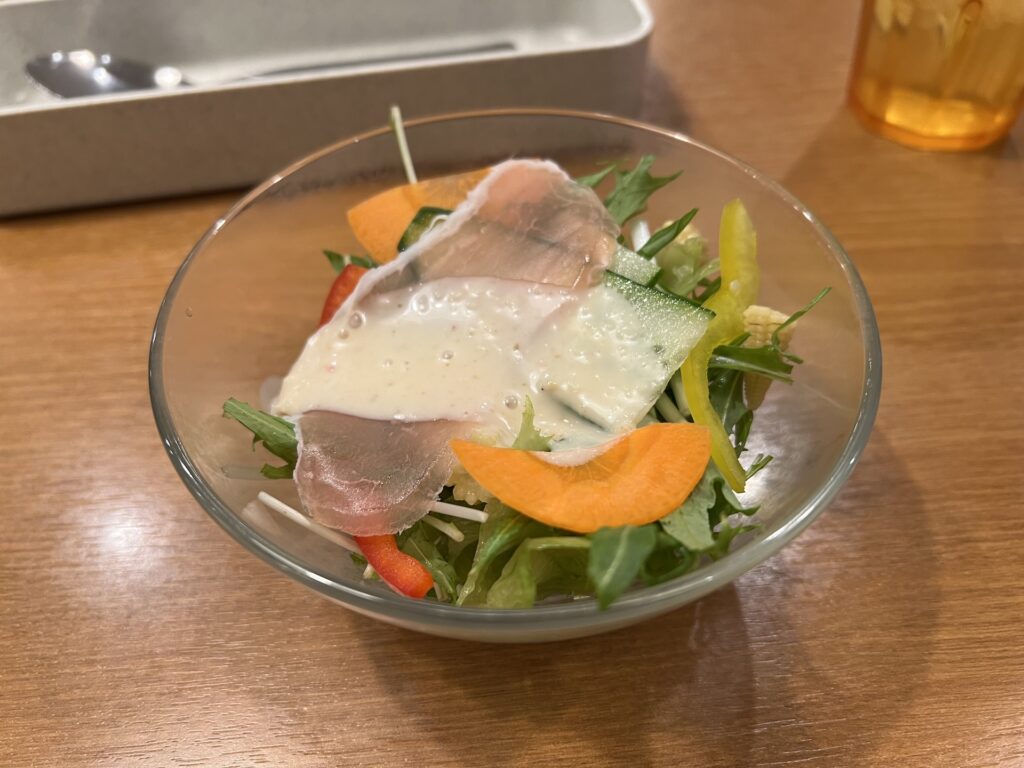 「みそスープ」は小さい紙コップでセルフ形式、鍋の中身がほとんど入ってなかったので店員さんに告げたら満杯の奴に交換してもらった。注ぐと紙コップがめちゃ熱くてしんどい。先にサラダが来たので食べておく、この器にデカいフォークだと非常に食べづらいのですが。