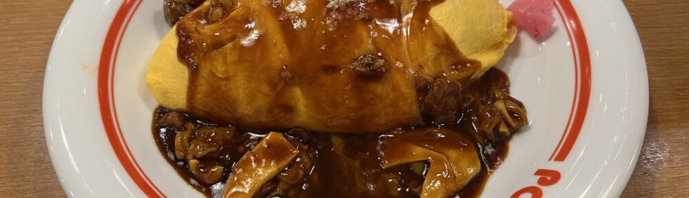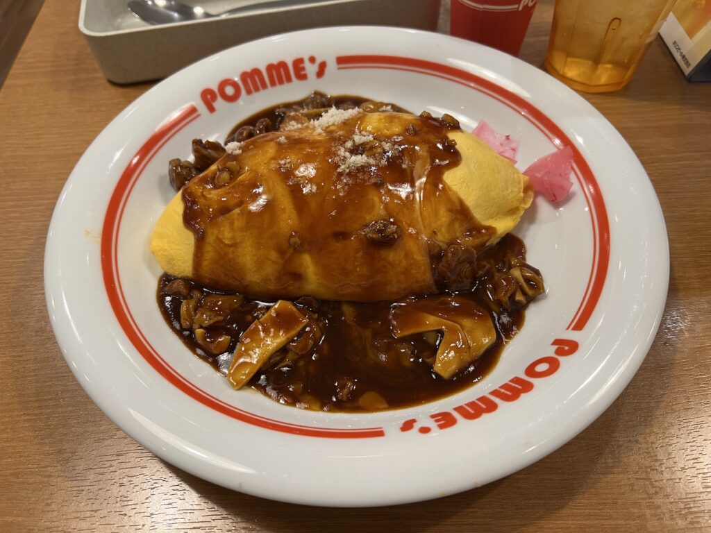 その後にオムライスが来た。「MサイズはマジでデカいのでSサイズにしとけ」とどこかで見たのでSサイズにしたのだが、Sサイズはごく普通のサイズだな。SSサイズが女性向けなんだろうけど、周りを見る限りではほとんど全員Sサイズっぽい。