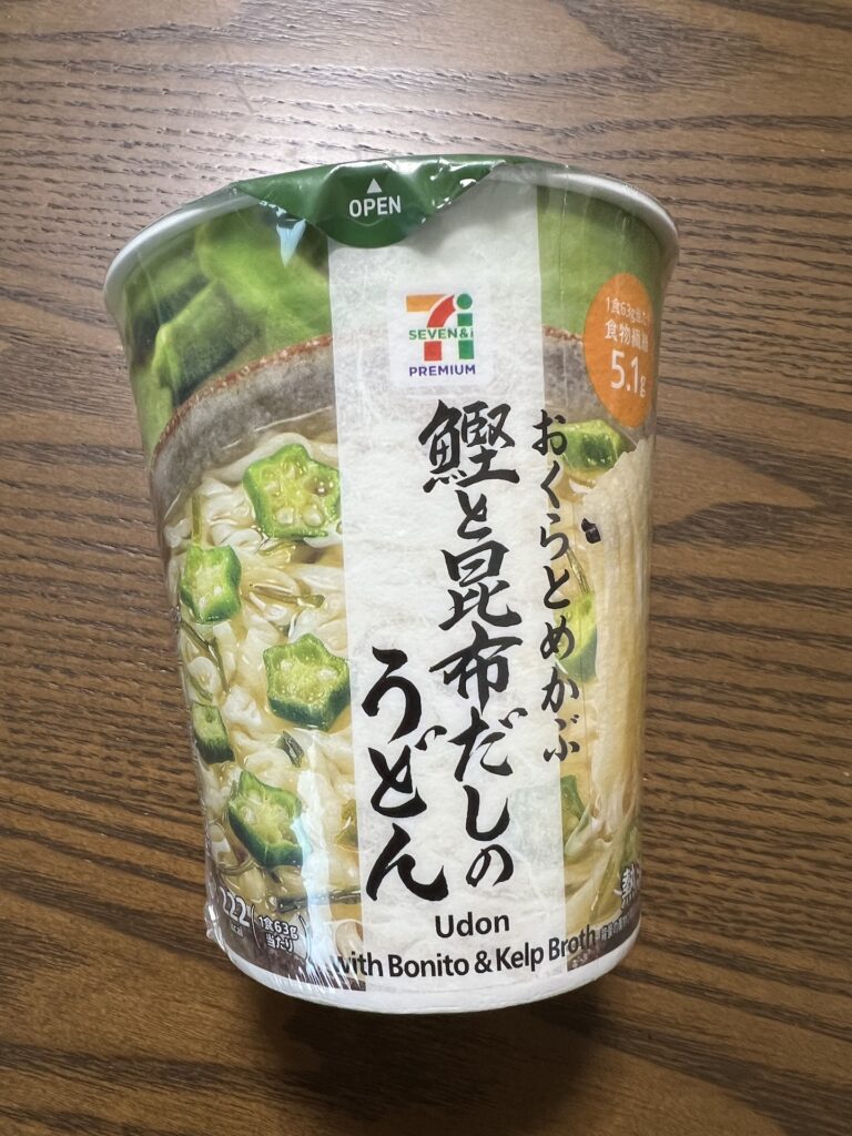 掃除が終わったタイミングで昼ごはん、先日セブンイレブンで買っておいた「おくらとめかぶ 鰹と昆布だしのうどん」カップ麺を食べてみる。