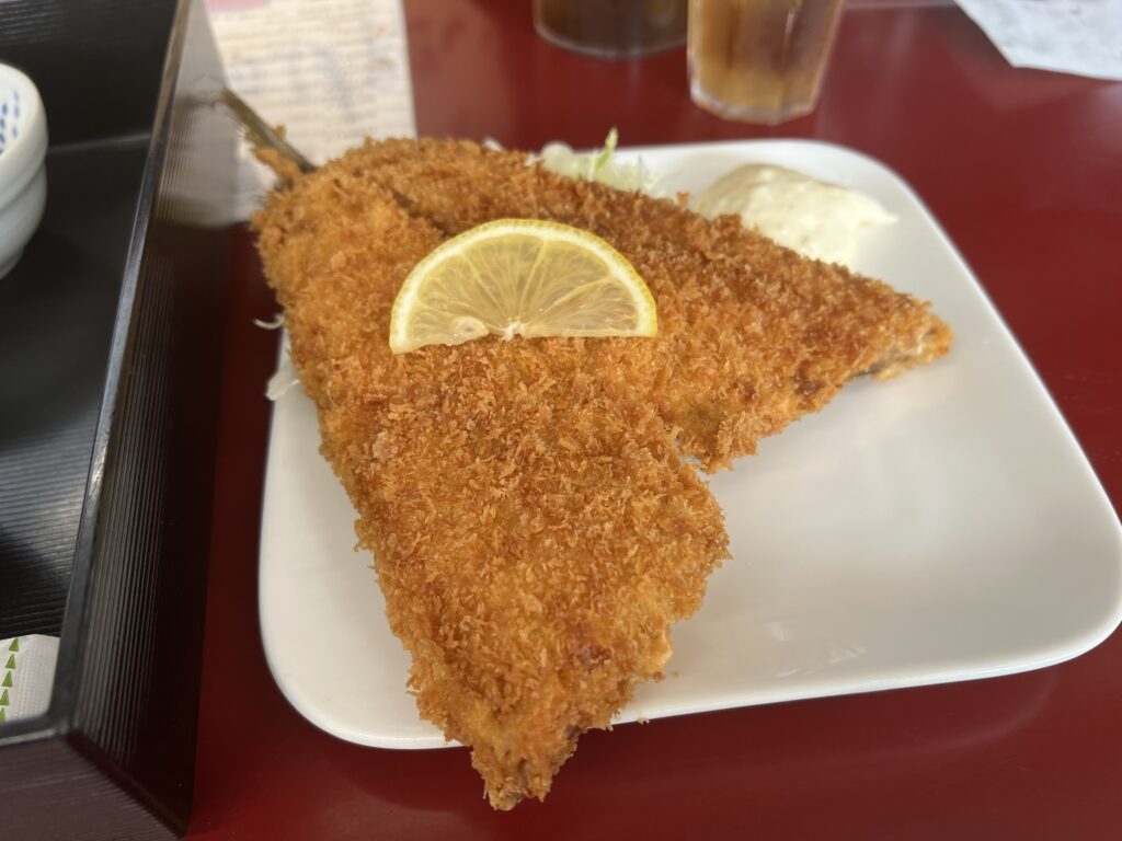 定食で共通な奴はお膳に入ってそれ以外は皿で提供するスタイルらしい。メニューに「大きい」って書いてあるだけあってアジフライがデカい、衣は固めだけどしっかり旨い。タルタルソースとウスターソースはどちらも合う。