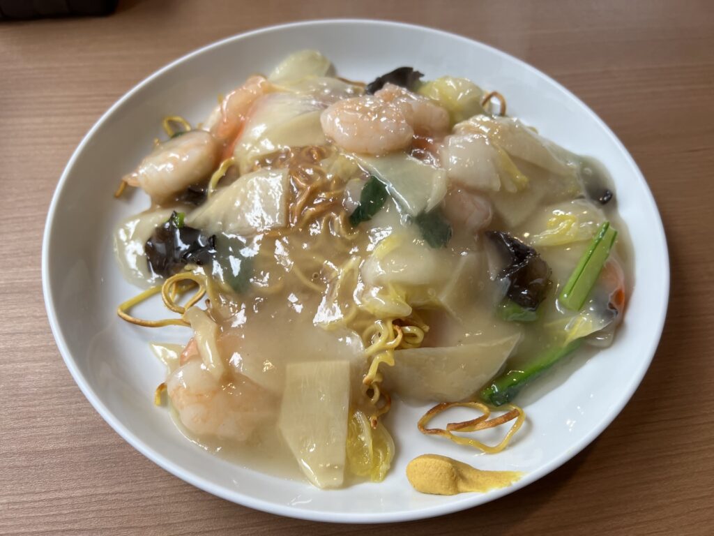 おひるは徒歩で外出して久々に「中華厨房かなめ」さんを訪問。満席で15分くらい待たされる、待ってる間に先に注文、「えびあんかけ焼きそば(内税1,100円)」と「単品ぎょうざ(内税140円)二個」にしておく。席に通されて5分くらいで焼きそばが来た。