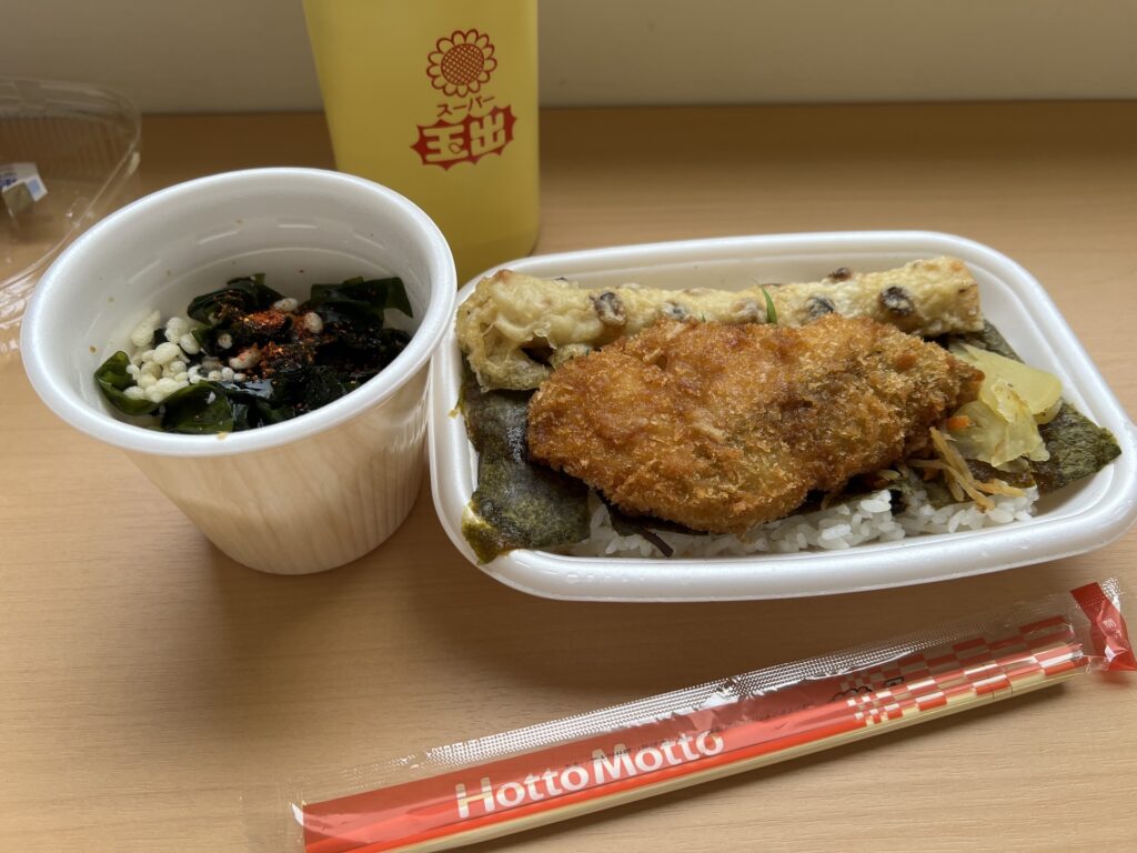 おえらいさんと他の人の面談が長引いたまま昼休みに突入したので、あきらめて会社最寄りほっともっとにて「のり弁当(内税470円)」と「ミニわかめうどん(内税160円)」を購入して持ち帰り、会社の休憩室で頂く。