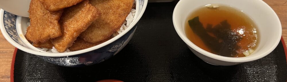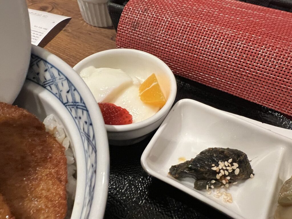 食べてみると肉がめちゃ薄い、あと固い。味は良いんだけど、とにかく「固い」「薄い」のがショックすぎる。食べたかったタイプのソースかつ丼では無いなコレ。ヨーロッパ軒みたいなのを期待してたのに。副菜と杏仁豆腐は普通。