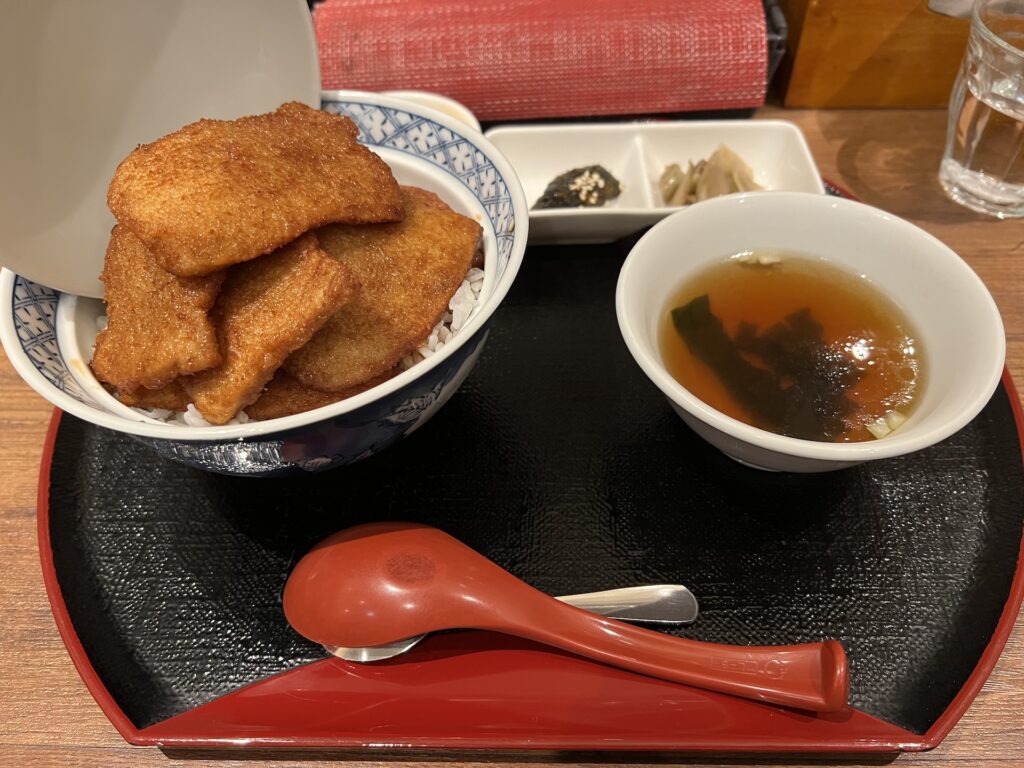 その後は徒歩でシタッテ札幌まで移動して気になっていた「麻SHIBIRE」さんに伺う、店舗前の券売機で「ソースかつ丼セット 副菜・スープ・杏仁豆腐付 大盛(内税1,600円)」を購入してカウンターに座り店員に食券を渡す。いい値段だけど仕方がない。しばらく待って着丼。