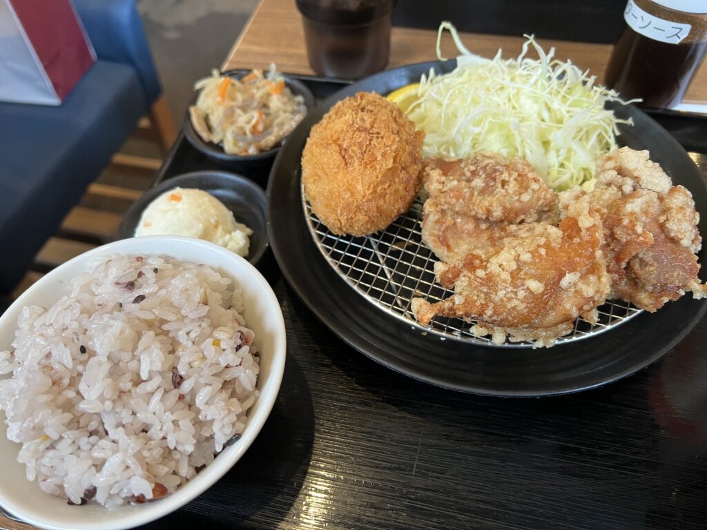 窓際の小さいテーブル席に案内された後はQRコードから「ザンギ+自家製カニクリームコロッケ定食(外税980円)」を「十六穀米 小」「ポテトサラダ+切り干し大根」「塩ザンギ」で注文。珍しい注文なのか結構待たされる、前回と同様にソースが付いてこないので店員さんにウスターソースを持ってきてもらった。