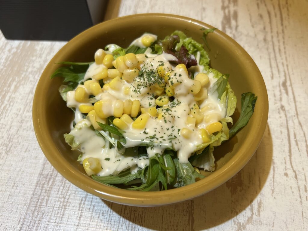 北18条まで歩いて「ハヤシ屋」さんに来た。今日は「スパゲティナポリタン(内税890円)」でトッピングに「とろとろオムレツ(内税250円)」、さらに「コーンサラダ(内税200円)」を券売機で買って注文。ナポリタンは大盛400gまで無料なので400gでお願いする。最初にコーンサラダが来たので食べる、相変わらず大きめのフォークだとちょっと食べづらい。