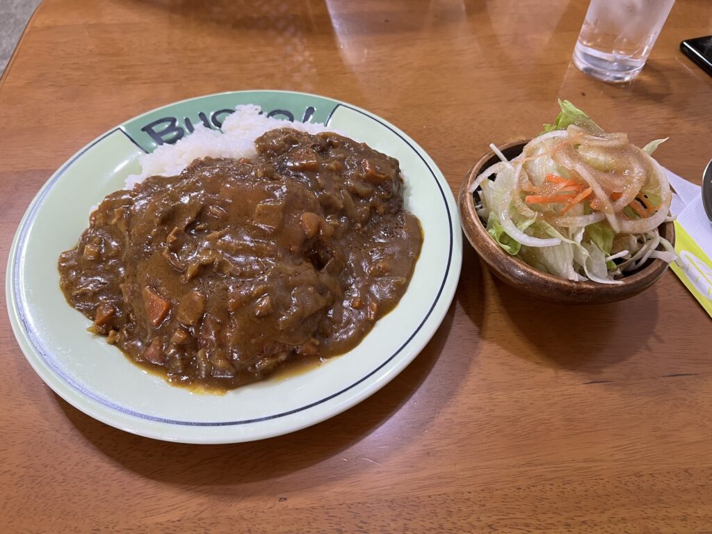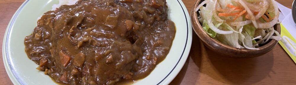 食べてみたらカレーが旨い、ドロドロで味も濃厚なので「自宅の二日目のカレー」みたいな感じ。ハンバーグもしっかりとした食べ応えで美味しい。