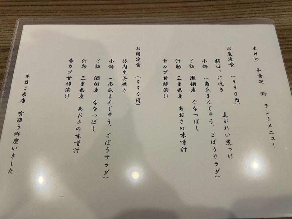 と思ったらマクドナルドまであと100m弱、数か月前に閉店した喫茶店跡地に新しい店がオープンしていた。「和食処 鈴」って名前で店の前に出されたランチメニューは魚と肉料理が選べるらしい。散々悩んだ結果、マクドナルドを諦めて急遽入ってみることにする。後で調べたら正式オープンは11/17だったっぽい、まだ一週間ちょいか。