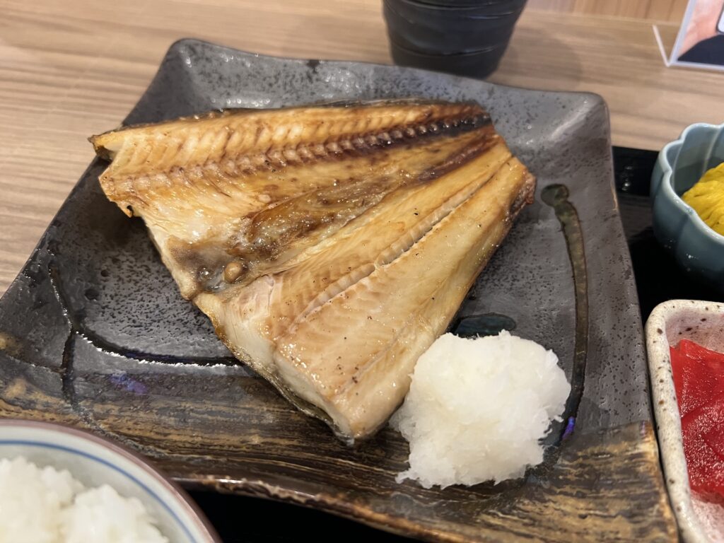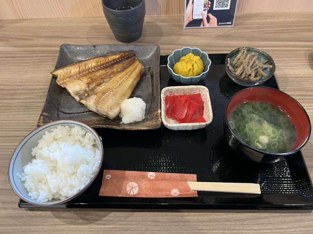 待ってたらおじさんが「今日の魚定食は縞ほっけ焼きと真がれい煮つけが選べますが、どちらにしますか?」と聞いてきた、いやそれはスマホで選べるようにしとこうよ、とか思いつつ「縞ほっけ焼き」の方でお願いする。キッチンが見えるけどメインのシェフは一人っぽい。しばし待ってたら料理が到着。